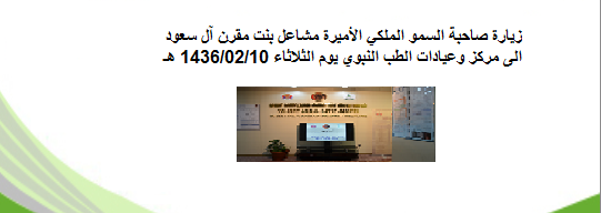 تشرف كرسي يوسف عبد اللطيف جميل للتطبيقات العلاجية في الطب النبوي بزيارة صاحبة السمو الملكي الأميرة مشاعل بنت مقرن بن عبد العزيز آل سعود يوم الثلاثاء 10 /2 /1436 هـ الموافق 2 وقامت سمو الأمير بزيارة مركز الطب النبوي…